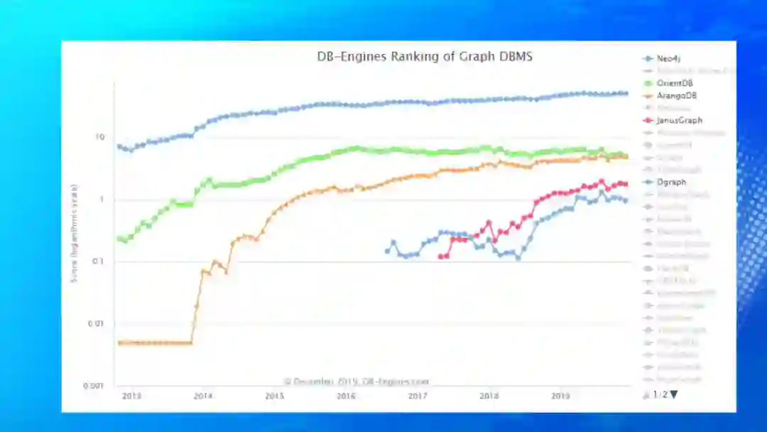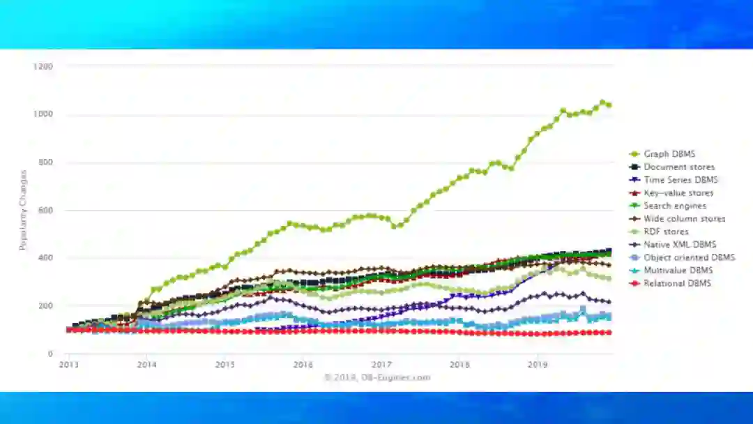 这是DB-Engines上的各种类型数据库的流行度趋势图,可以明显的看出图数据库在近两年来越来越流行,越来越被大众所关注。