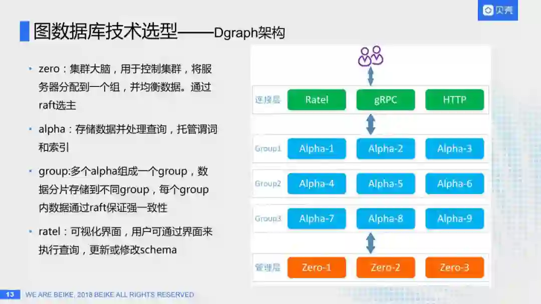这是Dgraph的架构,它的架构其实非常简单,所有功能都是原生支持的,不依赖于任何第三方系统,右图从下往上看: