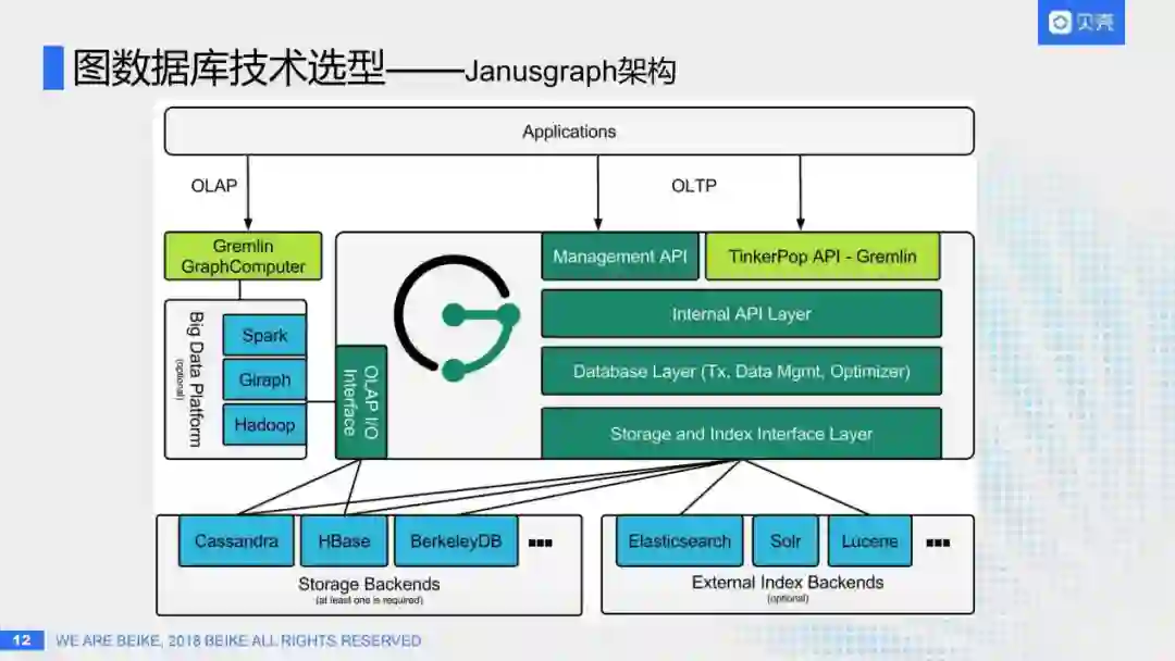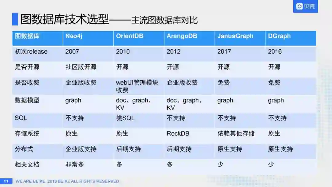刚才提到图数据库的应用场景非常广:搜索、推荐、关系图谱、知识图谱等等。目前贝壳也有各种场景需要使用到图数据库,但选型各不相同,有的部门使用JanusGraph,有的使用Neo4j,每个有需要的部门都得从头搭建一套。所以我们想是不是应该有一个通用的图数据库平台,可以支撑所有需要使用图数据库的场景,然后让做关系图谱、行业图谱的同学可以更关注于上层的算法和策略,而无需关注底层的存储、分布式、高性能、高可用等等?答案显然是确定的:我们需要这样一个统一的图数据库平台。那么目前图数据库领域已经有这么多产品,要做图数据库平台的话,到底应该选用哪一个呢?所以我们进入第二个主题,图数据库的技术选型。