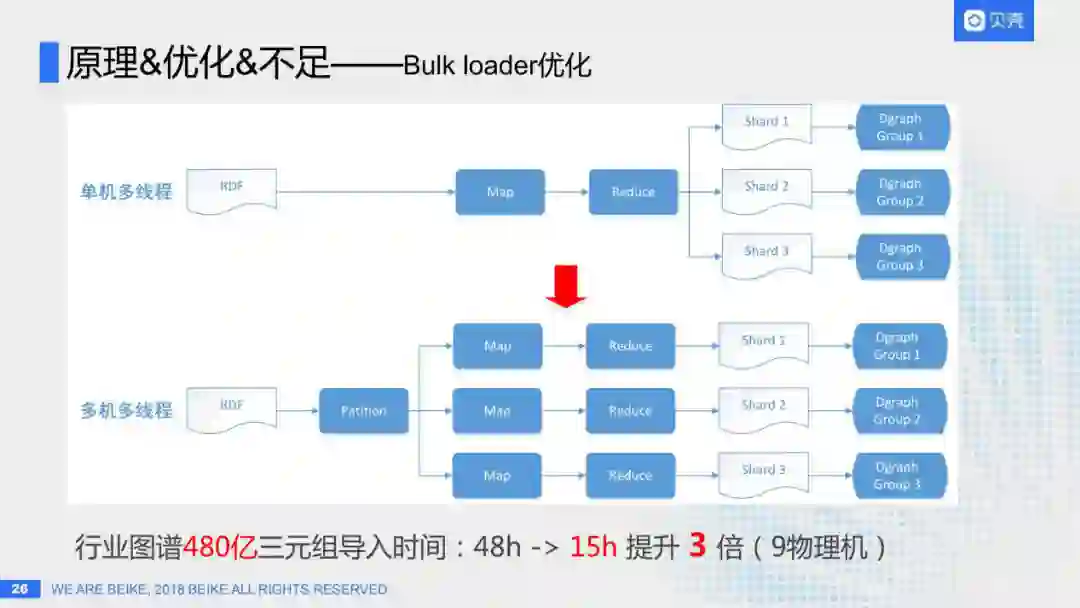 所以我们对源码进行了一定的优化,将原来的单机多线程改为了多机多线程模式,首先通过Partition模块,为原来的每条数据分配一个UID,这块还是单机执行的,把相同group的数据分到一个数据块中;然后把这些数据块分发到不同机器上,每台机器上都可以启动原来的Map进程和Reduce进程,每台机器都可以生成Dgraph需要的数据文件,再在每台机器上启动alpha进程加载这些数据文件,直至整个集群启动成功为止。这样把480亿三元组的数据初始化导入从48小时提升到了15小时,提升了三倍性能。