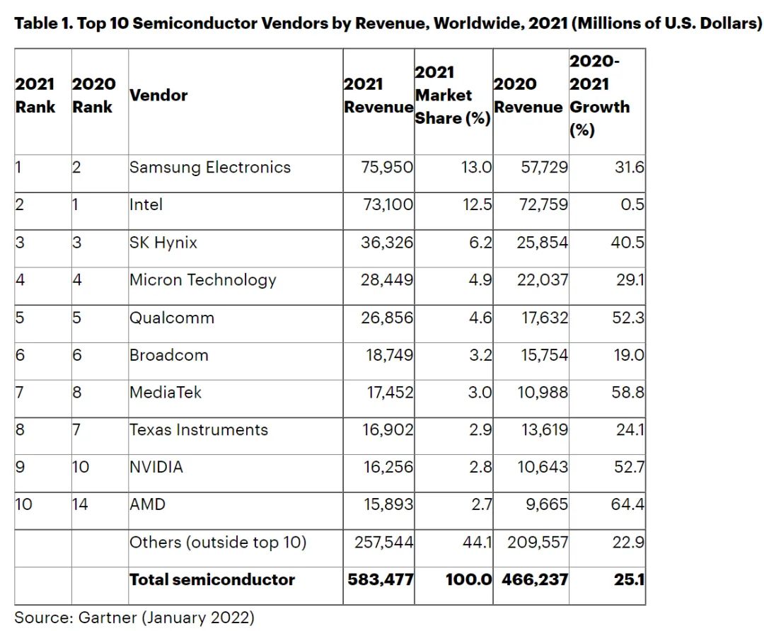 根据Gartner的调查结果,2021年全球半导体收入增长25.1%,达到5835亿美元,首次突破5000亿美元的门槛。Gartner研究副总裁Andrew Norwood表示:“随着全球经济在2021年反弹,整个半导体供应链都出现了短缺,特别是在汽车行业。强劲的需求以及物流和原材料价格上涨共同推动了半导体平均售价(ASP)上涨,从而推动了2021年的整体收入增长。”