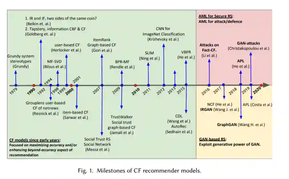 基于协同过滤(CF)的潜在因素模型(LFM),如矩阵分解(MF)和深度CF方法,由于其良好的性能和推荐精度,在现代推荐系统(RS)中得到了广泛的应用。尽管近年来取得了巨大的成功,但事实表明,这些方法易受对抗攻击的影响,即这是一种微妙但非随机的扰动,旨在迫使推荐模型产生错误的输出。这种行为的主要原因是,用于LFM训练的用户交互数据可能会受到恶意干扰或用户误操作的污染,从而导致不可预测的自然噪声和危害推荐结果。另一方面,研究表明,这些最初设想用于攻击机器学习应用程序的系统可以成功地用于增强它们对攻击的鲁棒性,以及训练更精确的推荐引擎。在这方面,本综述的目标有两方面: (i) 介绍关于AML-RS的最新进展,以保障AML-RS的安全性。(ii) 展示了AML在生成对抗网络(GANs)中的另一个成功应用,生成对抗网络(GANs)使用了AML学习的核心概念。在这项综述中,我们提供了一个详尽的文献回顾60篇文章发表在主要的RS和ML杂志和会议。这篇综述为RS社区提供了参考,研究RS和推荐模型的安全性,利用生成模型来提高它们的质量。