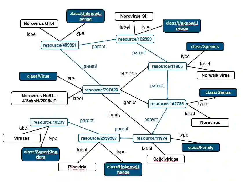parent关系用于连接Resource之间的层级关系,比如2019-nCoV 病毒在其家族树种的上层结点是unclassified Betacoronavirus。通过parent关系可向上遍历家族树。
