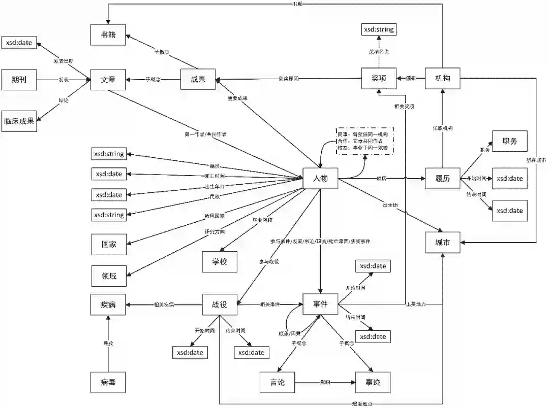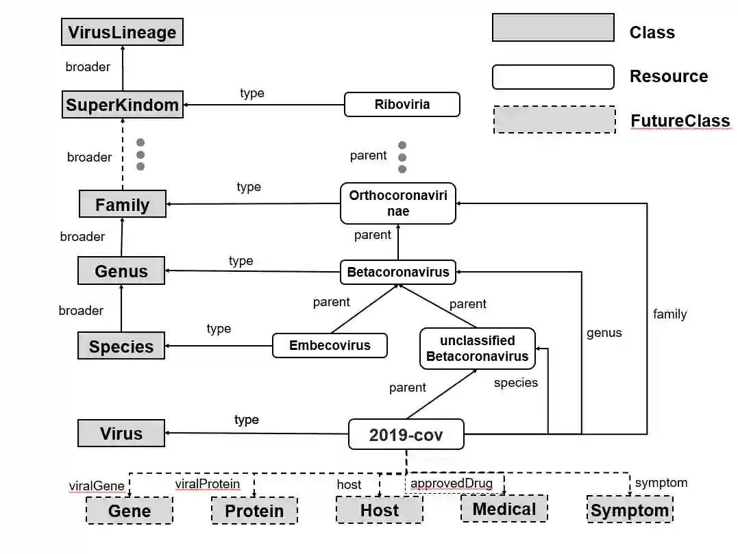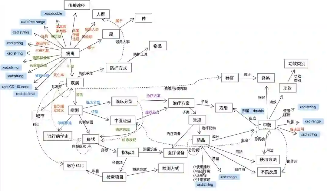 虚线中的关系和概念是未来工作中会添加的关系和连接的实体类型。比如病毒的基因实体、蛋白质实体、宿主实体等等。
