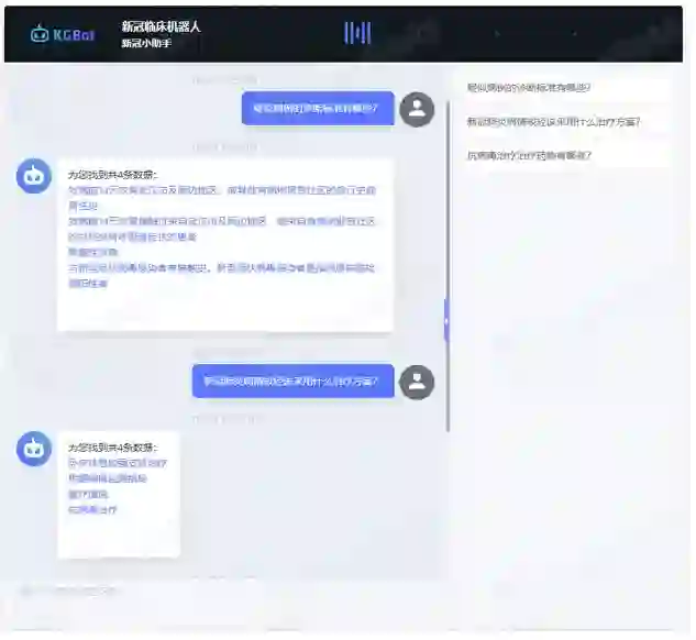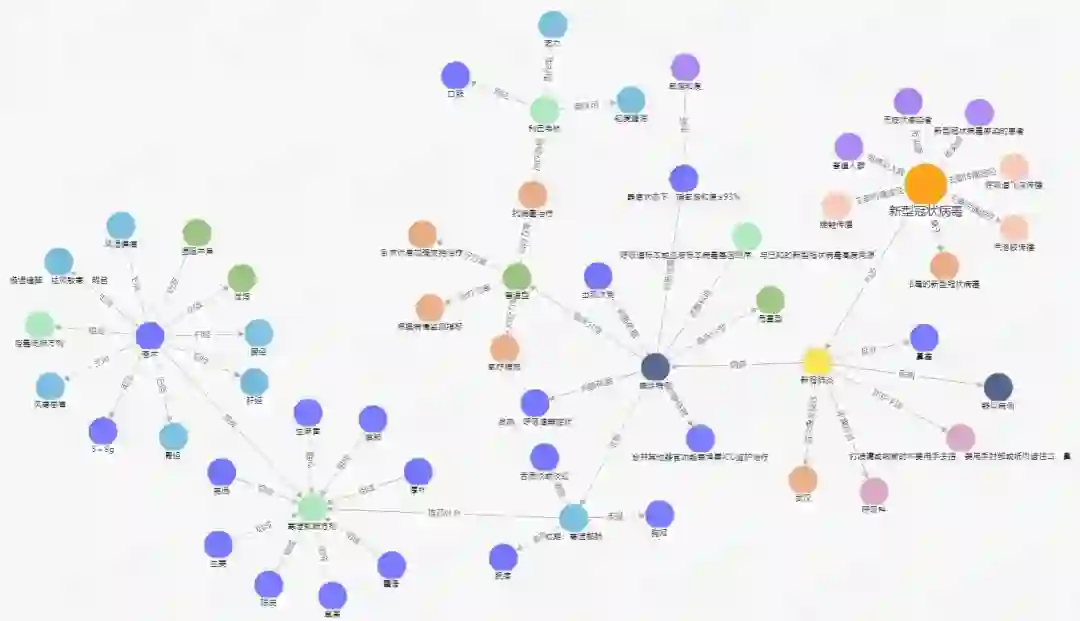 图谱以新冠肺炎为核心延展至病毒、治疗方案、症状、方剂等各类概念,形成新冠临床知识图谱,可基于该图谱进行知识问答。