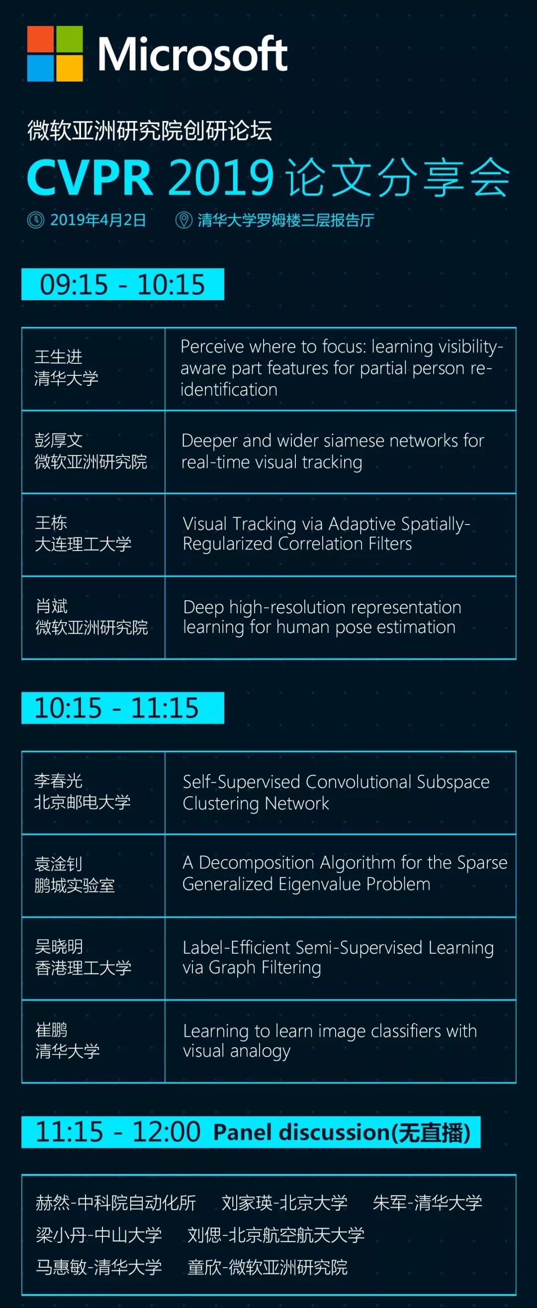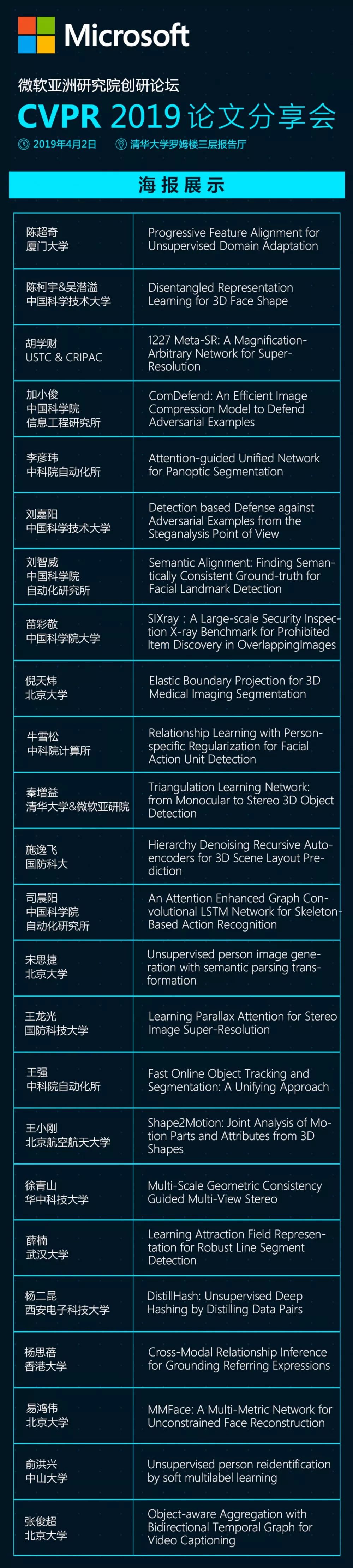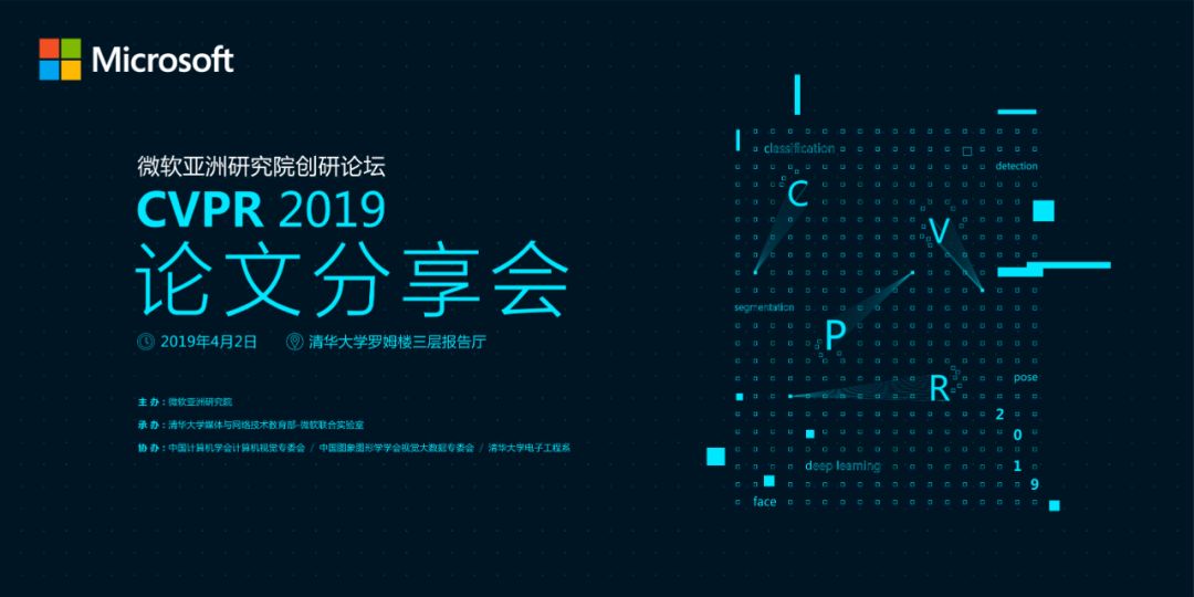 在此之前,来自国内外计算机视觉领域学术界、工业界的优秀代表们将携各自在CVPR 2019发表的最新研究和技术观点,于4月2日(下周二)举行的“微软亚洲研究院创研论坛 CVPR 2019 论文分享会”上进行交流、分享。