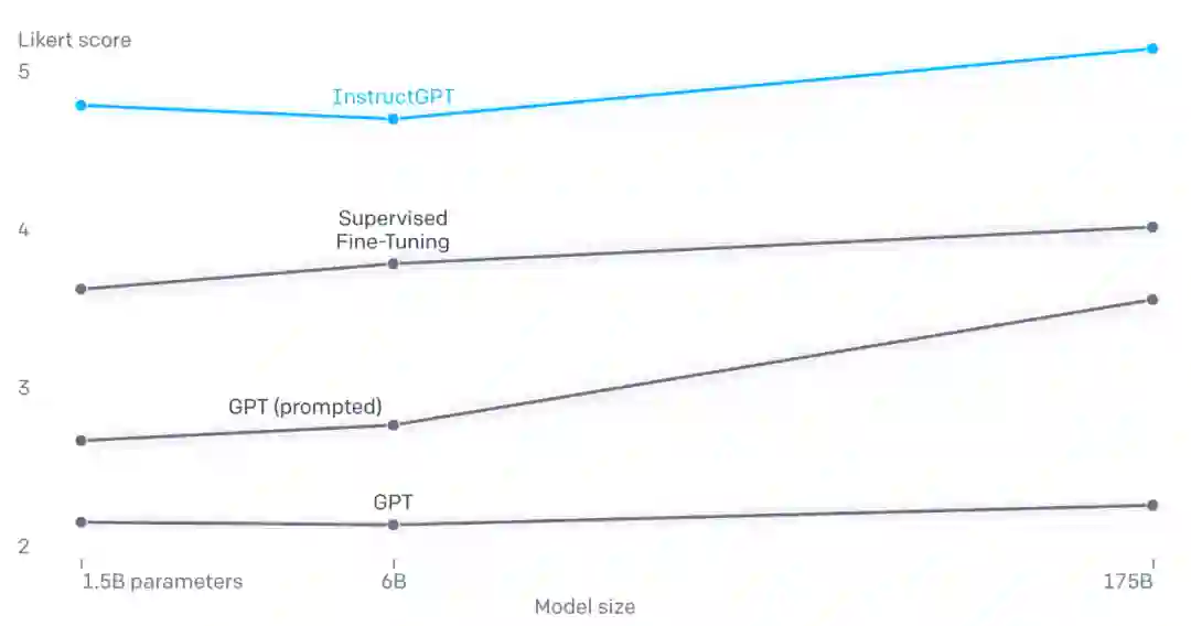 虽然 1.3B 的 InstructGPT 在参数量上还不及 GPT-3 的百分之一,但它的表现可比 GPT-3 讨人喜欢多了。