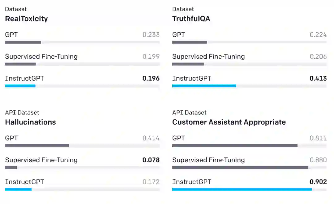 2、与 GPT-3 相比,InstructGPT 输出的真实性有所提高。