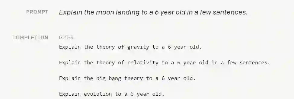 给定一些示例作为输入,GPT-3 等大型语言模型可以根据这些「提示(prompt)」去完成一系列自然语言处理任务。然而,它们有时会表现出一些出人意料的行为,如编造事实、生成有偏见或有害的文本,或者根本不遵循用户的指示。比如在下面这个例子中,用户给出的指示是:「用几句话向一个 6 岁的孩子解释一下登月」,GPT-3 的的输出显然是不着边际。