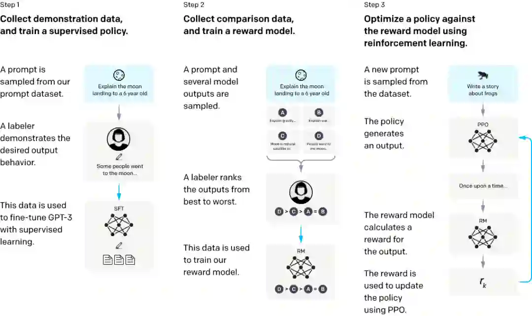 为了训练 InstructGPT 模型,研究者采用了人类反馈强化学习方法 ,即使用人类偏好作为奖励信号来微调模型。这一点很重要,因为要解决的安全和一致性问题是复杂的、主观的,并且不能完全被简单的自动度量捕获。