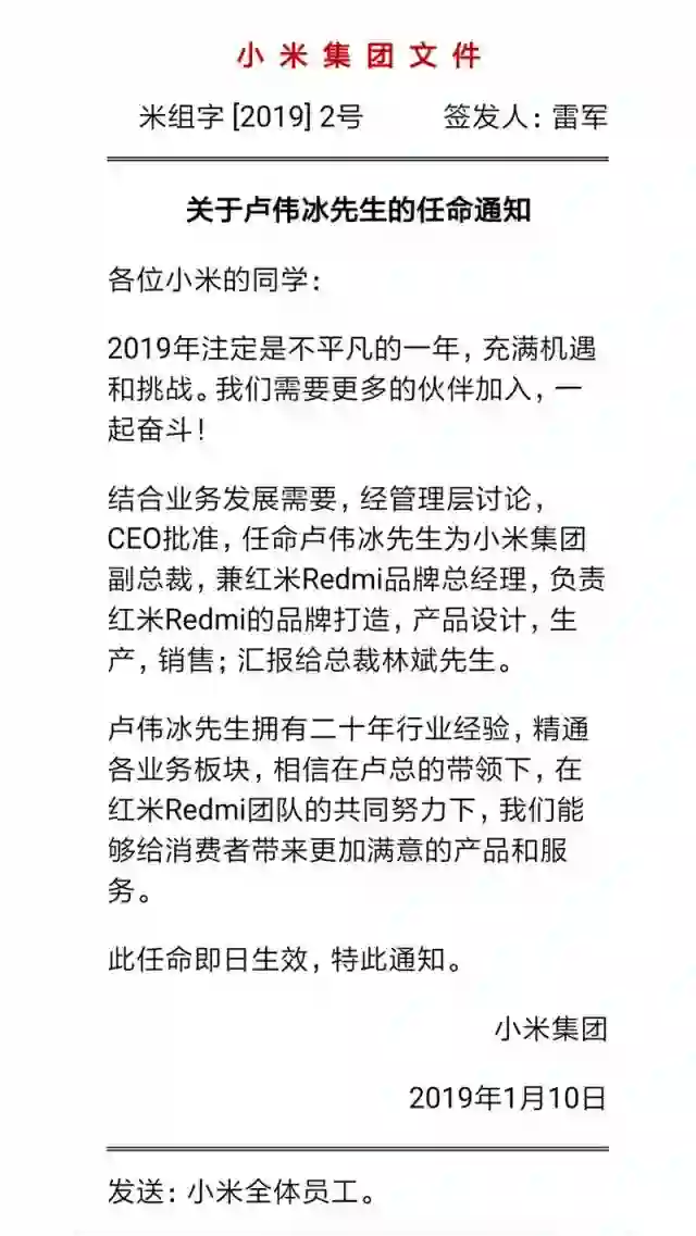 1月10日消息,小米集团向全体员工发布通知:任命卢伟冰为小米集团副总裁,兼红米Redmi品牌总经理,负责红米Redmi的品牌打造、产品设计、生产、销售,向总裁林斌汇报。该任命即日生效。
