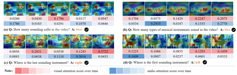 为了进一步说明所提模型的有效性和可解释性,该研究进行了一些可视化展示。其中热力图表示声源的位置,热力图下方的表格表示时序上的注意力分数。从可视化结果可以明显看出所提的模型在多模态视听场景中具有很好的理解和推理能力。