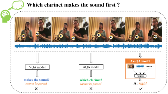 对于上面这个例子,若我们仅考虑基于视觉模态的 VQA 模型则很难对问题中涉及的声音信息进行处理,相反,若我们只考虑基于声音模态的 AQA 模型,同样难以对问题中涉及的空间位置信息进行处理。但是,我们可以看到同时使用听觉和视觉信息可以很容易的对场景进行理解并正确的回答上述问题。