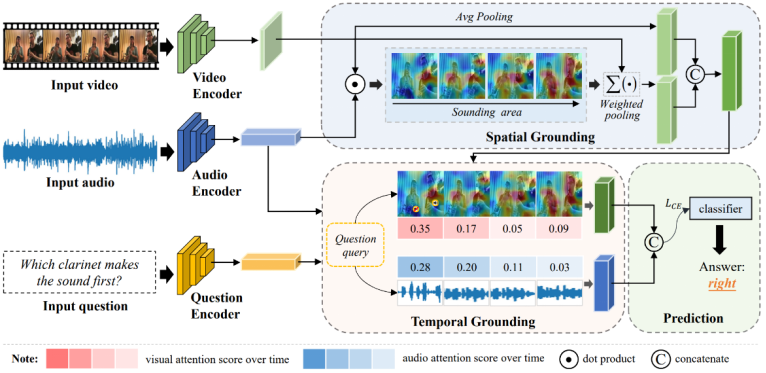 如下图所示的单簧管双重奏场景,当回答 “哪个单簧管先发声?” 的问题时,需要在视听场景中先定位出发声的单簧管,并在时序维度上重点聚焦于哪个单簧管先发出声音。要正确回答这个问题,本质上需要有效地对视听场景理解和时空推理。