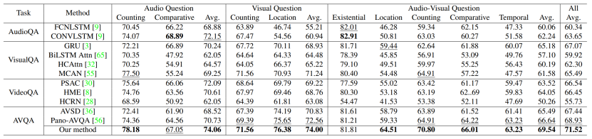 近年来,研究人员在声音对象感知、音频场景分析、视听场景解析和内容描述等方面取得了显著进展。尽管这些方法能将视觉对象与声音关联,但它们中的大多数在复杂视听场景下的跨模态推理能力仍然有限。相比之下,人类可以充分利用多模态场景中的上下文内容和时间信息来解决复杂的场景推理任务,如视听问答任务等。现有的视觉问答(VQA)和声音问答(AQA)方法等往往只关注单一模态,从而不能很好的在真实的视音场景中进行复杂的推理任务。