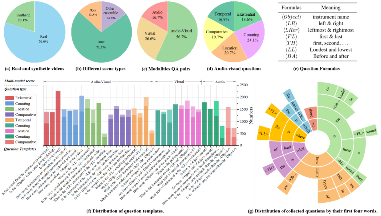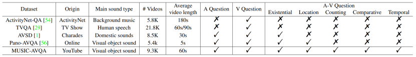 如表 1 所示,该研究发布的 MUSIC-AVQA 数据集具有以下优势:1)MUSIC-AVQA 数据集涵盖大量的声音问题、视觉问题和视听问题的问答对,比其他问答类数据集更全面丰富。对于大多数问答任务数据集(ActivityNet-QA, TVQA 等)来说,仅包含了视觉问题,难以探索视听相关的研究。虽然现有的 AVQA 数据集(AVSD, Pano-AVQA 等)也提供了视听问答对,但它们更专注于相对简单的问题(Existential 或 Location),只需要空间推理即可做出回答。2)MUSIC-AVQA 数据集由包含丰富视听成分的乐器演奏场景组成,有助于更好地研究视听交互场景理解和推理,并可以在一定程度上避免场景中的噪声问题。大多数公开问答类数据集(ActivityNet-QA, AVSD 等)中的声音信息通常与其视觉对象不匹配,会产生严重的噪声(如背景音乐),这使得它们难以探索不同模态之间的关联。此外,TVQA 数据集虽然包含视觉和声音模态,但其声音是由人类说话声组成的,在其问答对构建过程中也只使用了相应的字幕信息,并不是真正的视音关联场景。