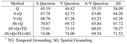 如表 2 所示,引入 Audio 和 Visual 模态信息都有助于模型性能的提升。此外,能明显看到当结合声音和视觉模态时,AV+Q 模型的性能比 A+Q 和 V+Q 模型要好得多,这表明多感官感知有助于提升问答任务的性能。我们也能看到视音空间关联模块和时序关联模块都能够很明显的提升模型的性能,从而更好地对场景进行理解。