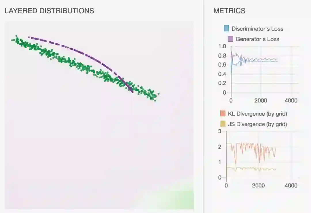 GANLab 的最右边,是 Metrics 量表区,展示一些学习过程中的 Loss 情况;一般来说,这些Loss 信息,并不能用来判断 GAN 到底收敛与否。具体情况, 大家可以自行尝试, 相信你会对 GAN 有一个全新的认知。