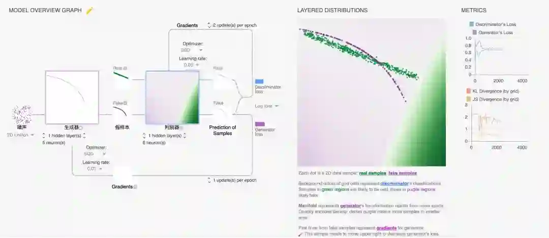 左侧的网络区, 包含了这个 GAN 的网络结构,和生成过程。中间的展示区,展示了,生成器生成的假样本(图中紫色),在不断拟合真样本(图中绿色)的过程, 同时,展示区,还通过背景颜色的不同,展示了判别器,对各个样本的判别结果:紫色背景,表示判别为假; 绿色背景表示判别为真。