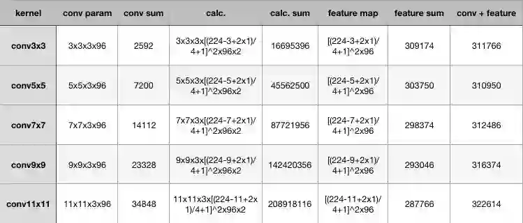 在计算量这里,为了突出小卷积核的优势,我拿同样conv3x3、conv5x5、conv7x7、conv9x9和conv11x11,在224x224x3的RGB图上(设置pad=1,stride=4,output_channel=96)做卷积,卷积层的参数规模和得到的feature map的大小如下: