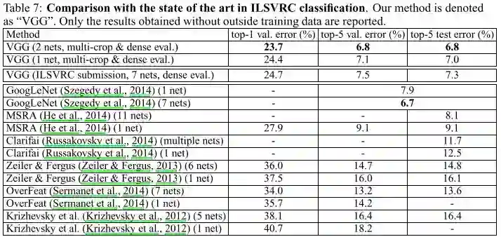 然而,分类性能上同样的单模型,VGGNet比GoogLeNet在top5的错分率要低,虽然不确定是否是因为GoogLeNet没做multi-crop和dense eval.,但假设他们都做了,这样看来似乎VGG从实验结果上表现出其结构设计上比GoogLeNet更适合解决分类问题。