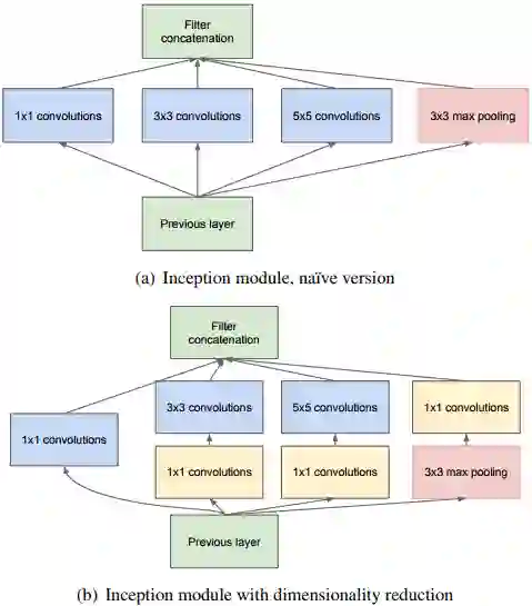 关于小卷积核前人就有使用,如Ciresan et al. (2011)还有Goodfellow et al. (2014),后者使用11层的网络解决街道数量的识别问题(street number classification,我也没看懂是回归还是分类),结果显示更深的网络可以带来更好地网络性能。而作者在小卷积核的基础上使用了更多层数,2014年ImageNet分类比赛的第一名使用GoogLeNet,Szegedy et al., (2014)也使用了更小的卷积核、更深达到22层的网络,使用了5x5、3x3和1x1卷积(实际还用到了7x7的卷积,第一层卷积)。但GoogLeNet的拓扑结构比较复杂,上图是Inception module的结构图,可以看到module内直接使用了常见的三种卷积核进行并联,并将最后的结果feature map直接concate到一起,而VGGNet则是使用传统卷积核串联的方式。