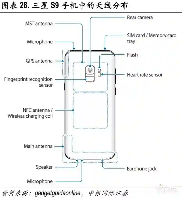 以三星旗舰智能机S9为例,其内部有传统的移动通信主天线(配合高通骁龙845基带,支持4X4 MIMO、5个分量载波聚合),位于手机的下部和左下部。