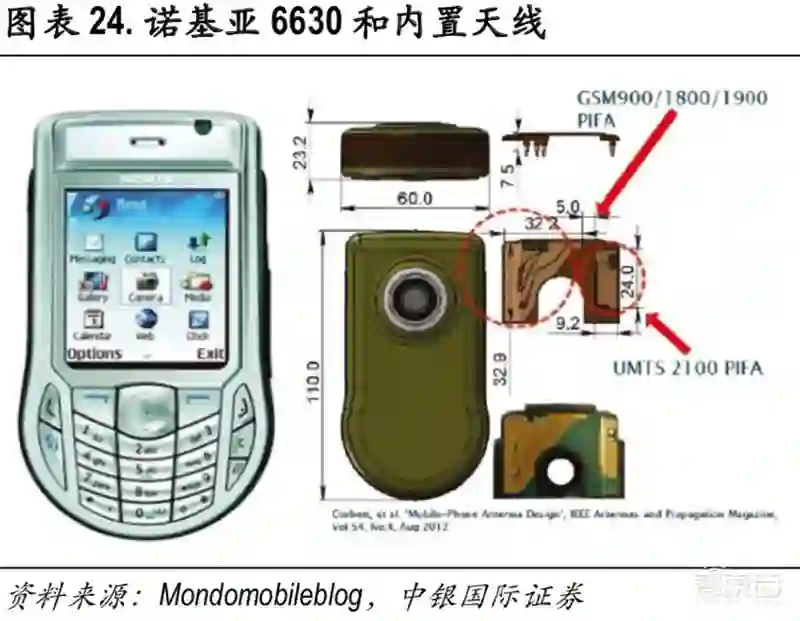 2004年推出的3G Nokia 6630手机,可以真正意义上支持全球漫游,是第一个双模三频段手机,所使用的天线也是多天线内置。