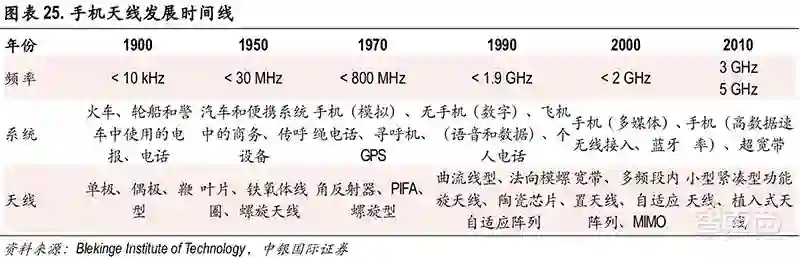 从手机诞生以来,通信频率在逐渐从最初的kHz发展到了GHz频段,而天线的尺寸也经历了从大到小,从外置到内置的变化。
