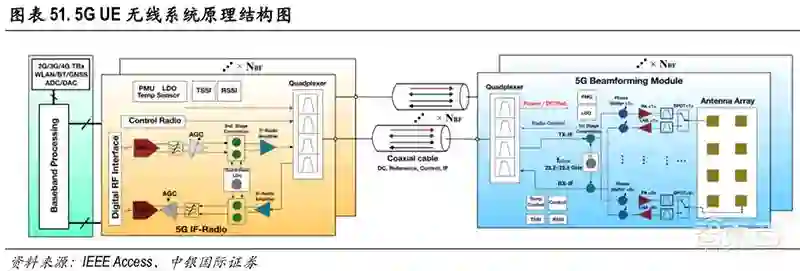 上图给出的是一种针对毫米波的射频前段解决方案。从系统上讲,与天线配合工作的射频前端芯片需要针对每个天线单独控制,因此不仅是MIMO天线数量的会直接增长,射频前端电路的需求量和天线是同步的。