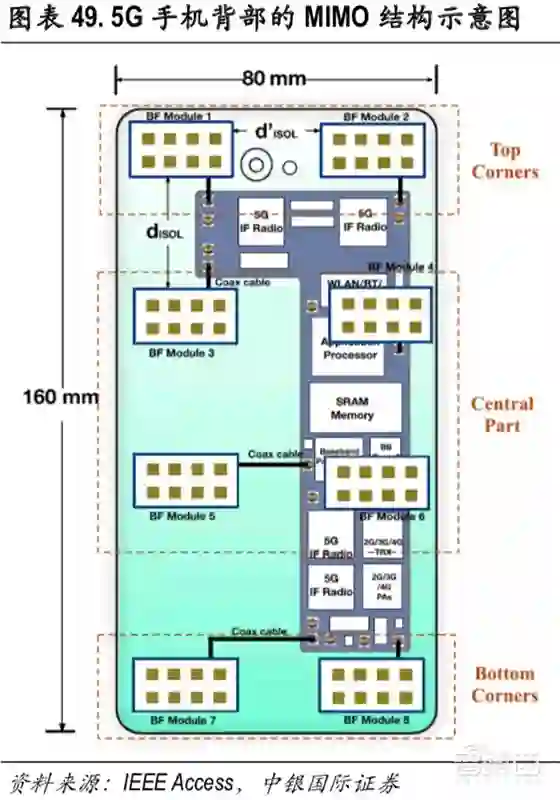下图给出了针对5G手机提出的一种分布式相位阵列MIMO结构的手机设计方案,其中有8个相控阵列单元形成波束赋形模组,内嵌在手机壳背面下方。