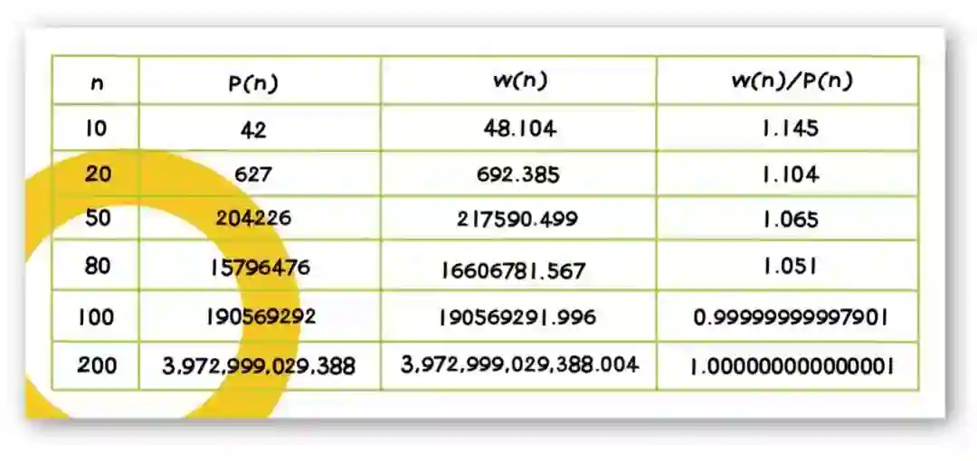哈代和拉马努金将公式右边给出的w(n)值与MacMahon计算出的P(n)值进行比较: