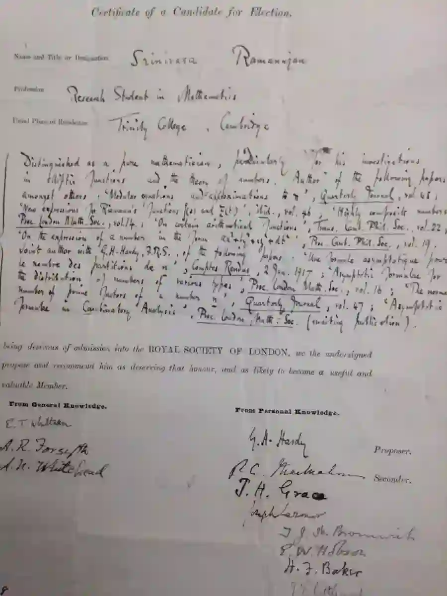○ 拉马努金被提名为皇家学会会员的证明。