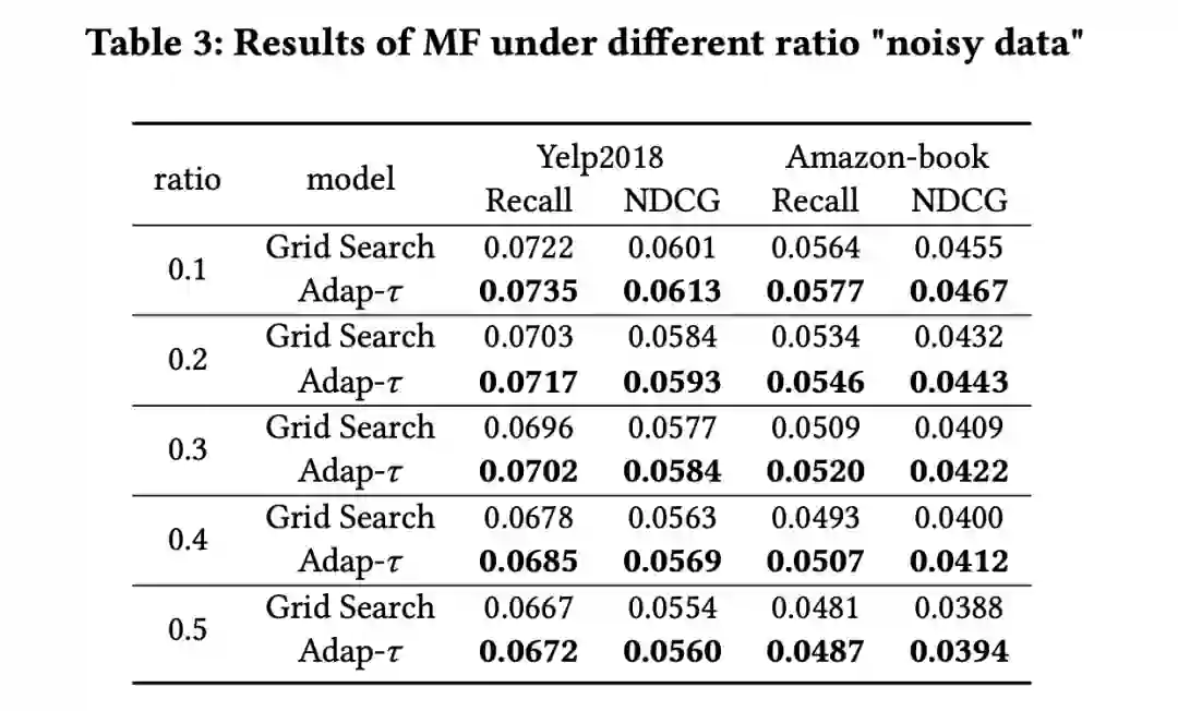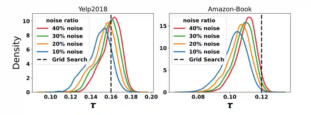 同时对于局部自适应,我们记录各个组别下 𝜏 的分布情况,由图可知我们的策略确实可以在用户间实现细粒度的调整,即噪音比例越小,温度系数值越小;反之亦然。