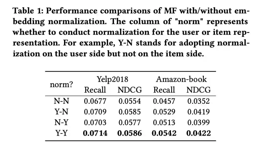 为了进一步验证归一化的优势,我们测试推荐性能,变量为是否对用户或物品表征进行归一化(下表)。可以看出,具有双侧归一化(即对用户和物品的表征都进行归一化操作,记做 Y-Y)的模型显著优于具有单侧归一化(即 Y-N 或 N-Y)的模型;并且它们都超过了没有归一化的模型(N-N)。