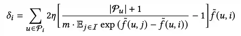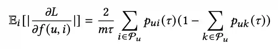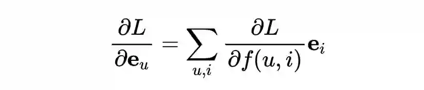 用于训练推荐模型的损失函数有多种选择,包括 pointwise loss(例如 BCE,MSE),pairwise loss(例如 BPR)和 Softmax 损失。最近的工作 [1] 发现,Softmax 损失可以减轻流行偏见,实现良好的训练稳定性,并与衡量指标(ndcg)有一致性关联。此外,Softmax 损失可以被认为是常用 BPR 损失的扩展。因此,我们将 Softmax 作为分析的代表性损失,可以公式化为: