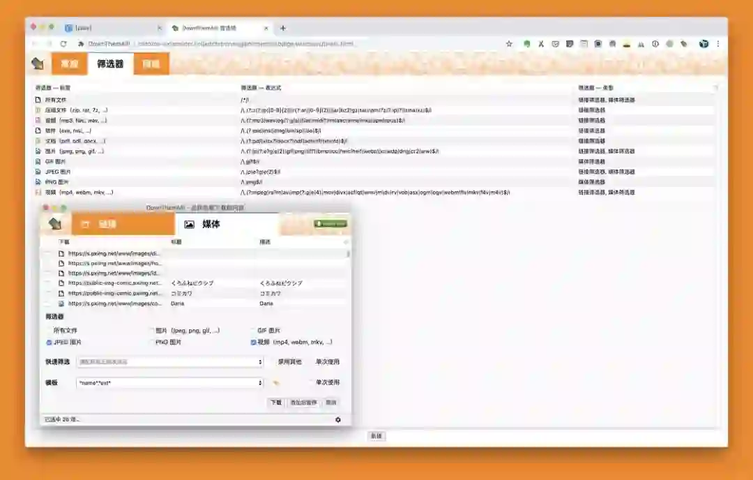与原生下载管理器相比,DownThemAll! 支持自动嗅探网页上的元素,并按照预设规则进行分类。
