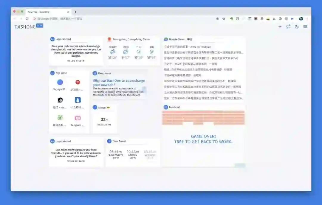 DashOne 预置了天气、新闻、笔记、书签、快速启动及多种效率工具,允许你阅读 RSS 订阅文章、查看 Gmail 未读邮件、速览 GitHub 通知、处理 Todoist 任务,甚至玩一局打砖块或连连看,还支持自由排列和暗色模式。