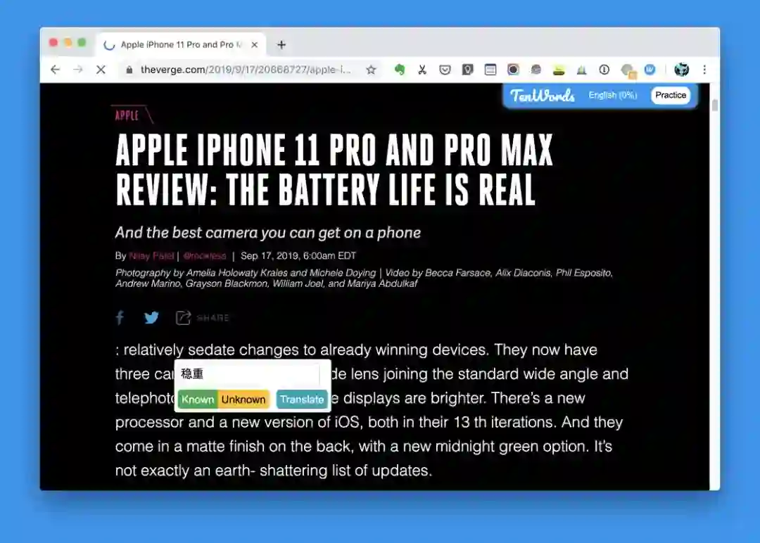 只需点击工具栏上的图标进入学习模式,你就可以通过鼠标轻点查询不认识的单词释义,并标注生词为「已掌握」或「不认识」,在 TenWords 的练习页面中温习。