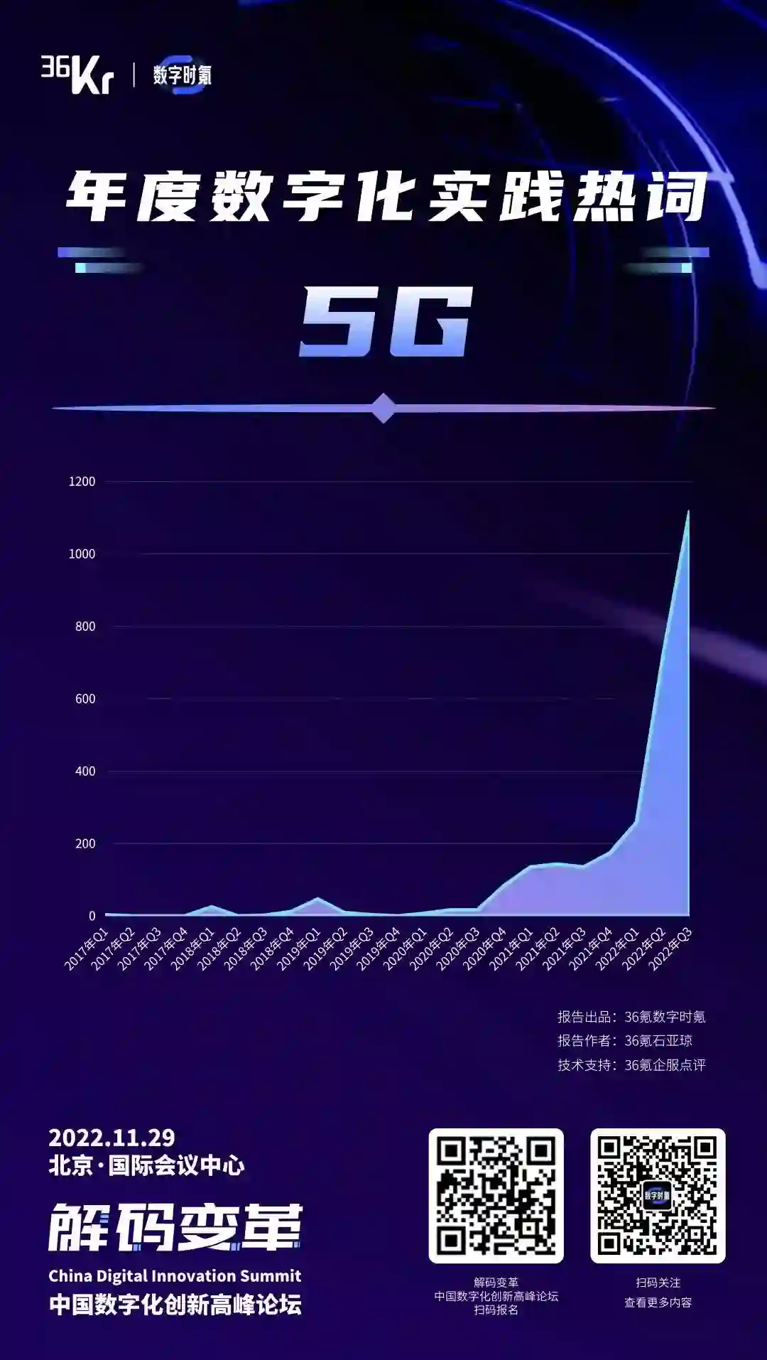 第二名——5G,同样出乎很多人意料。对于36氪编辑部的很多同事来说, 这个词早已经“不前沿”了,早在2013年我们就写下了第一篇关于5G的报道(https://36kr.com/p/1641729425409)。8年多过去了,截至9月末,我国5G基站总数达222万个,我国三大运营商5G套餐用户数合计已突破10亿,全球领先,5G在一些特定2B场景中小规模普及落地。