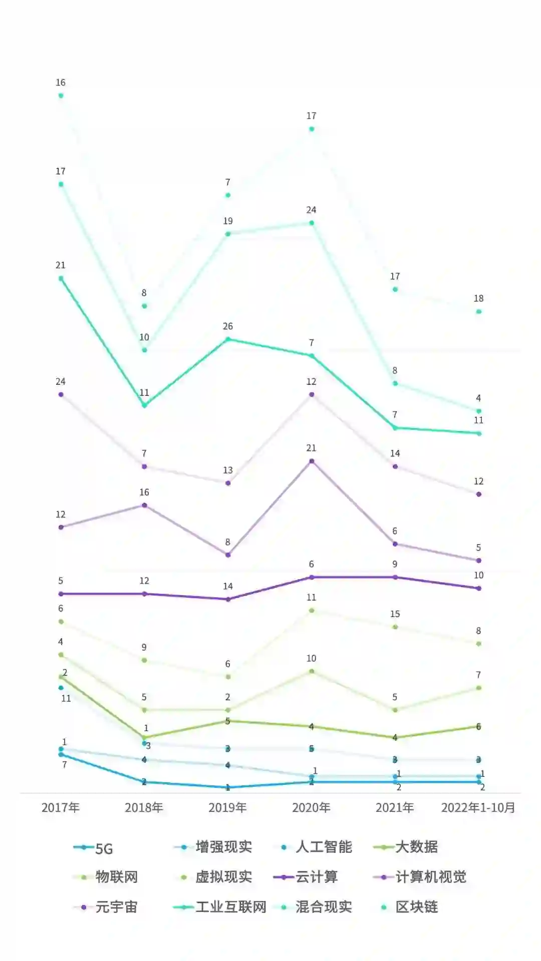 基于我们的统计,2022年1-10月这662家知名公司的2万多篇数字化相关报道中,涉及到最多的前10项细分技术包括:增强现实、5G、人工智能、拓展现实、计算机视觉、大数据、物联网、虚拟现实、数字孪生、云计算。