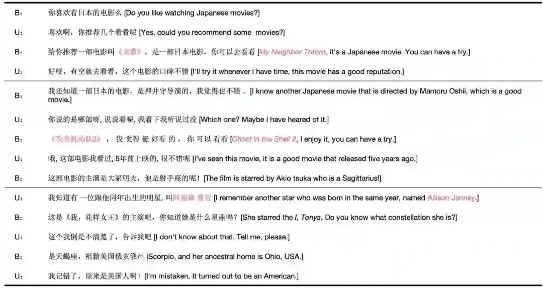 上图给出了一段人机对话样例(使用中文对话,翻译成英文)。在对话中,模型一共同人聊了三个话题(标红的实体)。
