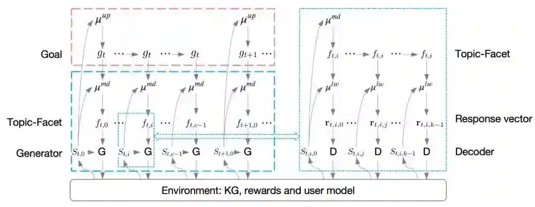 进一步地,我们提出基于知识图谱的三层层次化强化学习模型(KnowHRL)。其中,上层负责学习在知识图谱上规划话题序列;中、下层协同完成围绕话题的深入聊天。具体而言,中层在选定话题节点的邻居中选择一个可聊侧面;下层负责基于给定话题和话题可聊侧面同用户进行多轮对话。