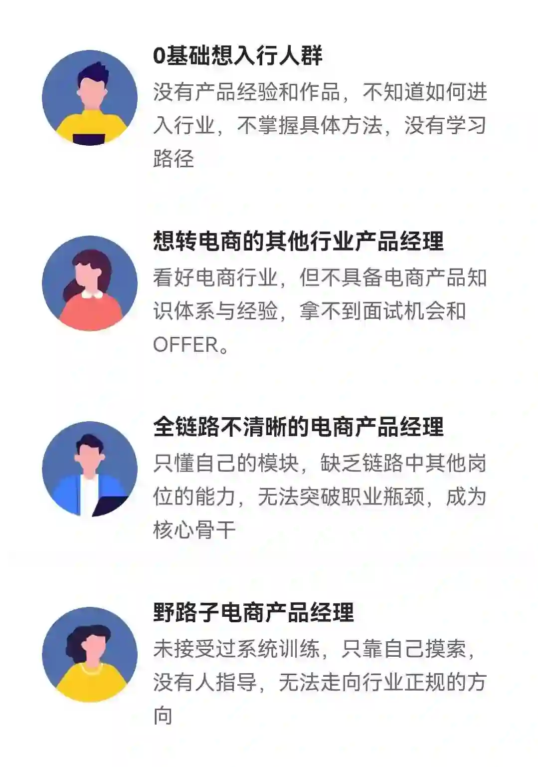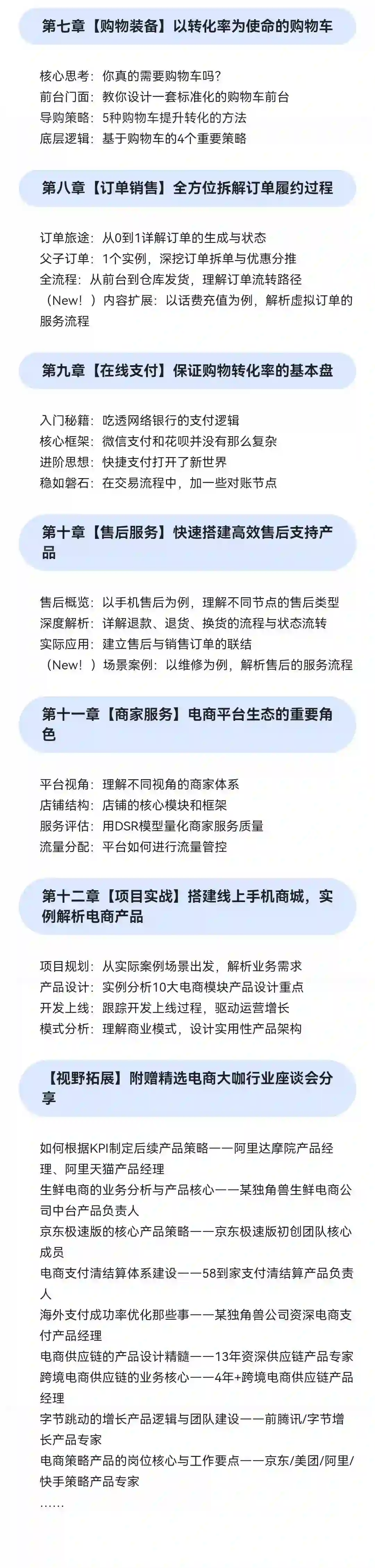 课程将从实战出发,通过 1 套电商体系课、48 场专项直播,8 次实操作业、1 个实战项目,365 天导师伴学,帮助 0-3 岁电商产品经理,系统掌握大厂规范的电商产品核心能力,成为有思考、有策略的高薪电商产品经理。
