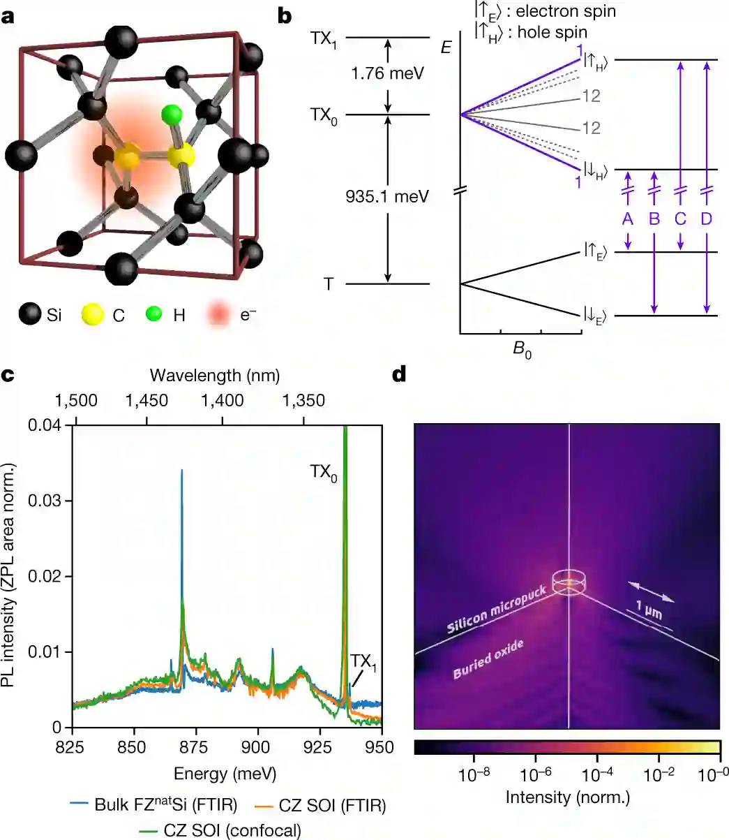 每个 T 中心都拥有一个不成对的电子自旋和一个氢核自旋,每个都可以作为量子比特。