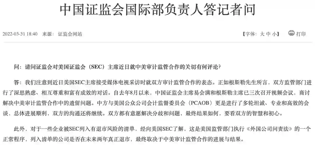 4月初,中国证监会还称将建立跨边界的双边合作机制,以期将相关的审计检查工作以双方都满意的方式正规化。