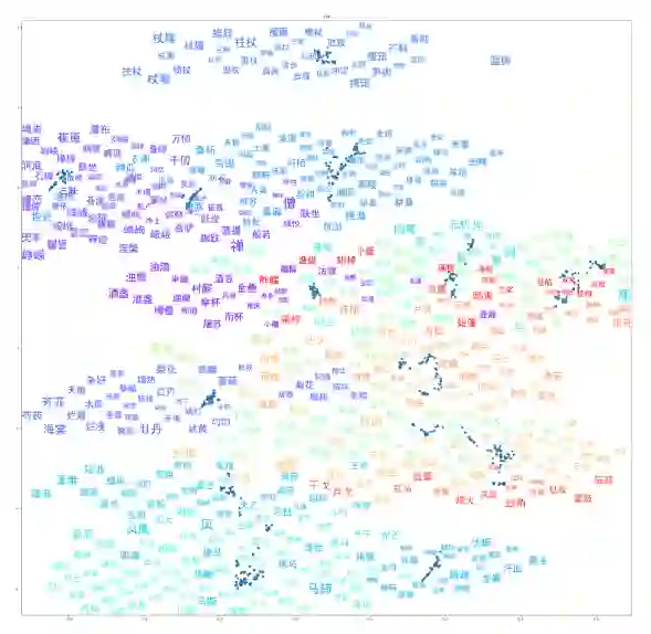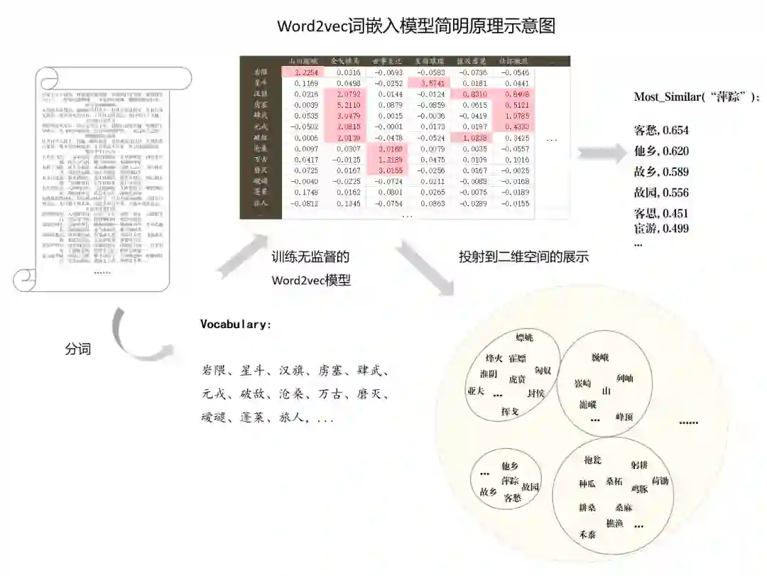 词嵌入模型可以从海量的诗歌文本中自动学习到字词之间的关联关系,据此可实现字词关联度分析、字词相似度分析、聚类分析等任务。