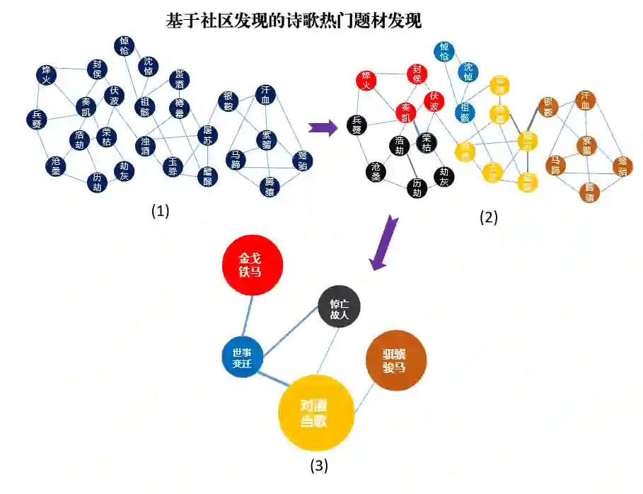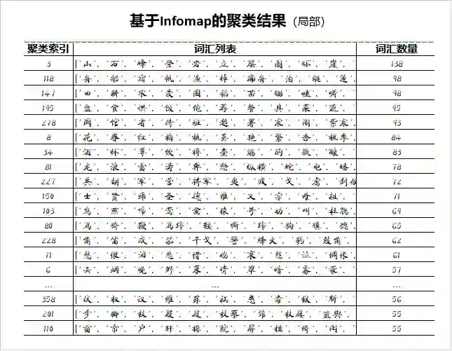 字词是承载诗歌题材的最小语义单元,如“五云山上五云飞,远接群峰近拂堤。若问杭州何处好,此中听得野莺啼”,看到其中的“五云山”和“群峰”,则可以给该诗打上一个“山川巍峨”的题材标签。由此,笔者接下来会基于社区发现算法,结合“词汇簇群--->词汇簇群语义特征--->题材标签”的思路来发现热门诗歌题材。