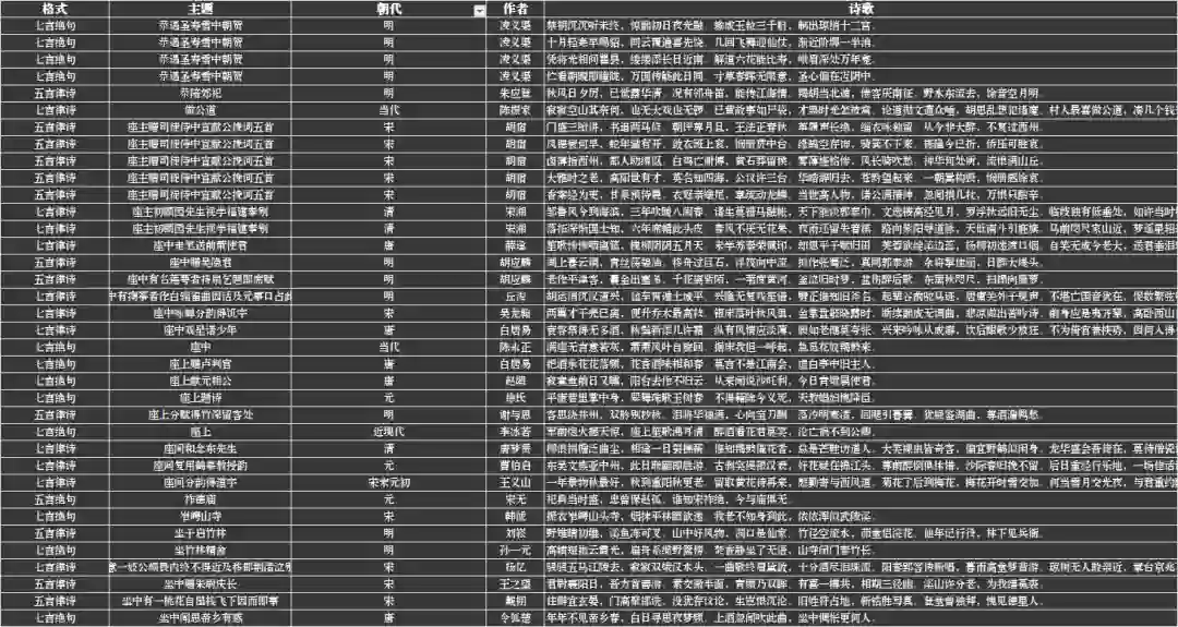 基于这个更加完善的诗歌题材分类体系,笔者运行完之后得到58W+行数据,在之前的基础上增加了14W+行数据,数据规模提升明显!