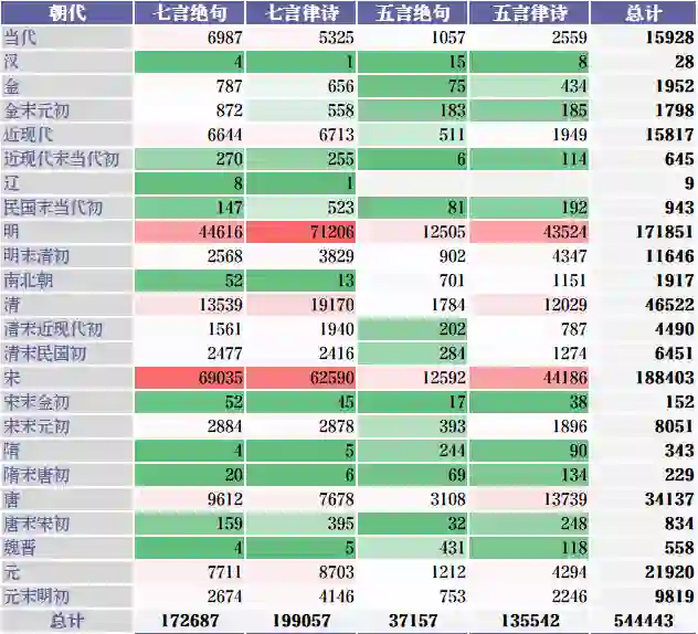 为了方便后续的分析,笔者仅取其中的律诗和绝句,且仅取其中的五言和七言,排律(如《春江花月夜》、《长恨歌》等)、杂言(如李白的将进酒)等就不在本文的分析范围之内。